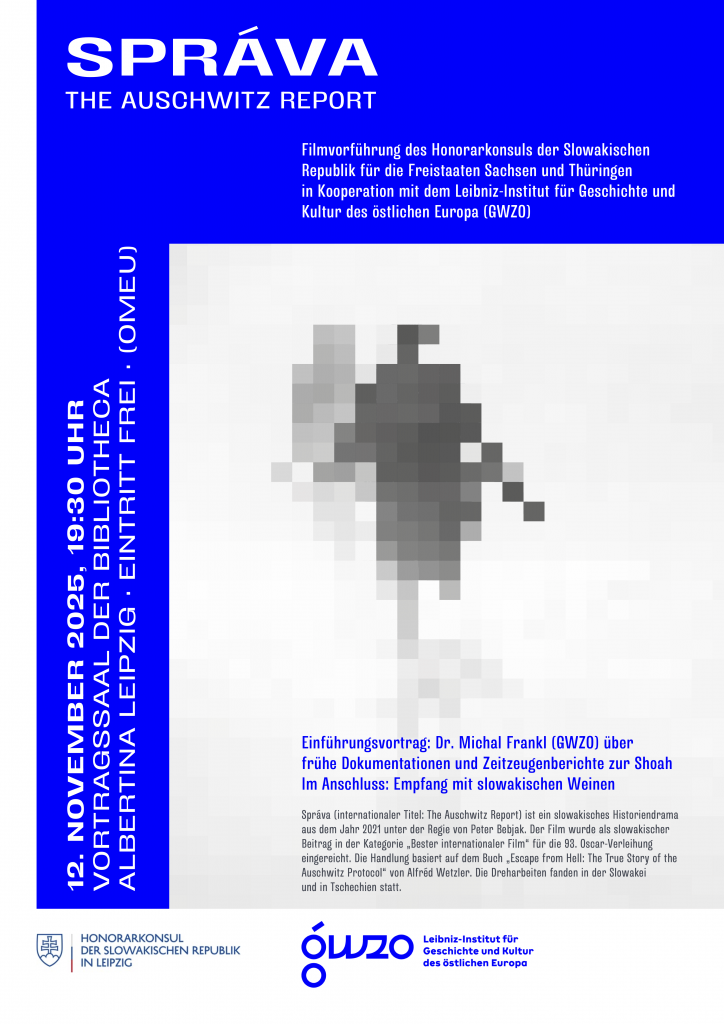 Am Mittwoch, den 12. November 2025 um 19:30 Uhr, zeigt der Slowakische Honorarkonsul das slowakische Historiendrama „Správa“ (The Auschwitz Report) in der Bibliotheca Albertina Leipzig. Der Film basiert auf dem Buch „Escape from hell: the true story of the Auschwitz protocol“ von Alfréd Wetzler.